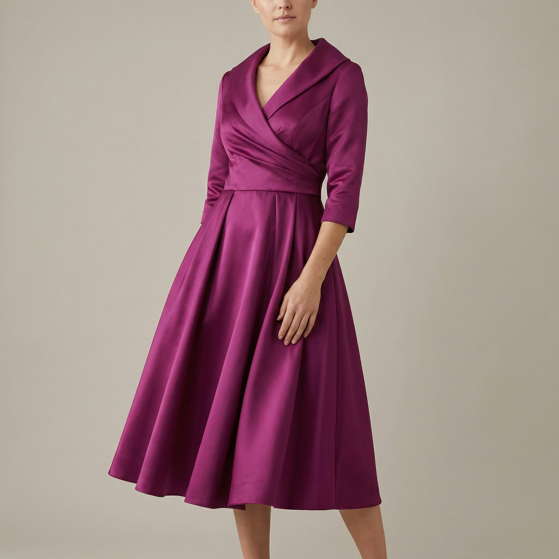 Made from a smooth, high-quality fabric with a refined finish, this dress feels luxurious without being stiff. The three-quarter sleeves provide elegant coverage, while the defined waistline creates a slimming, feminine shape without feeling restrictive. Thoughtful details like hidden side pockets add practicality without compromising style.