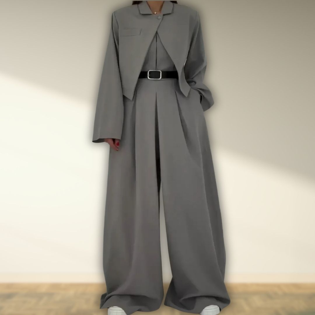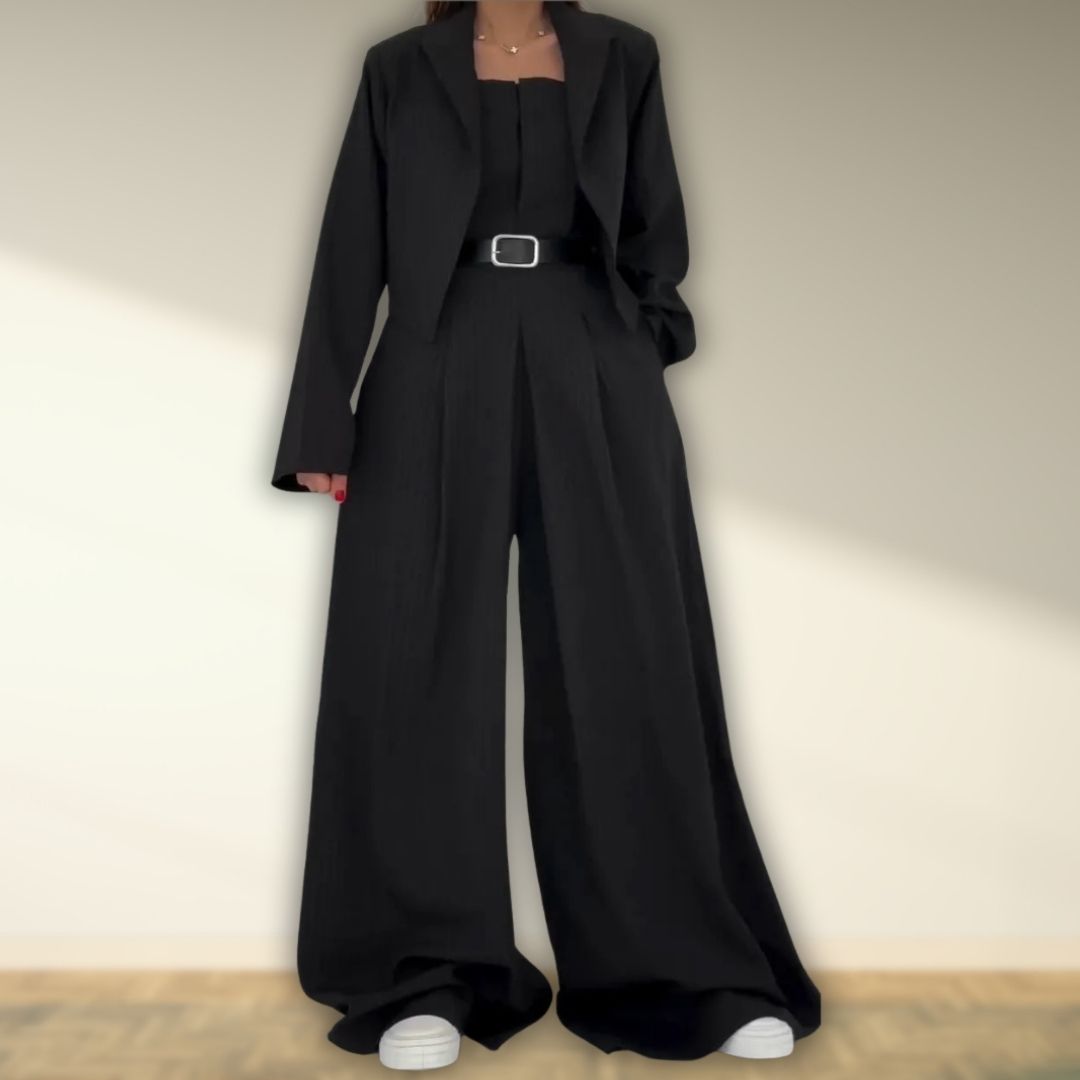 Our new Sadie three-piece set blends structure and softness, elevating your wardrobe with timeless sophistication. Featuring an elegant bustier, tailored wide-leg trousers, and a matching jacket, this look effortlessly transitions from confident daytime wear to elevated evening charm.